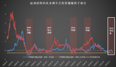 以萬得偏股混基金指數:持有一年回報和萬得偏股混基金指數:持有三年回報爲例。如果這個點位你买入後,一年,三年都不賺錢,說明這段時期對於投資者而言,投資體驗極差,我們以這個數據爲參考發現,該區間市場長期不斷尋底,磨底,但隨後往往能夠酝釀出較好的投資時期。