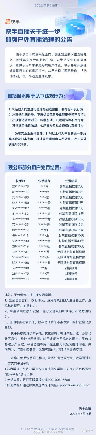 快手在今日下午發布加強戶外直播治理的公告。快手表示,將持續开展違規直播行爲的巡查和打擊,從嚴治理「惡意炒作」「低俗搭訕」等戶外違規直播亂象。