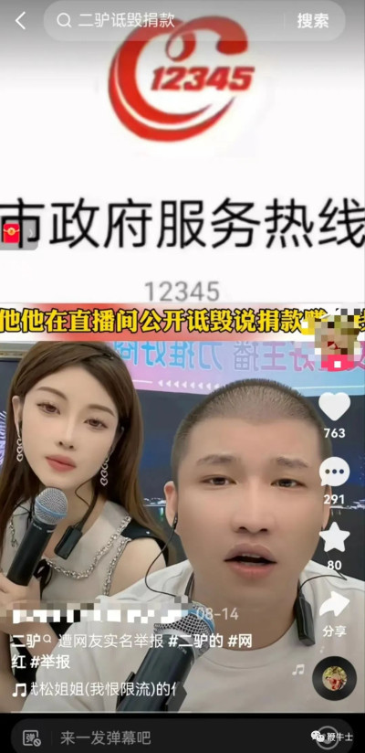 今年6月,二驢账號出現了暫無直播權限,疑似被封。前不久,账號「二驢的」因在直播間公开侮辱捐款,被網友實名向12345舉報,並要求對其封禁。