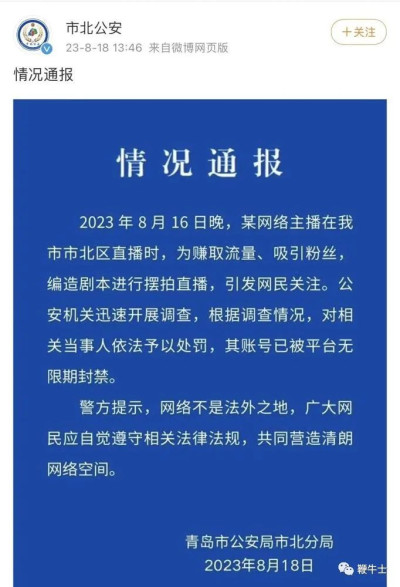 青島市公安局今日也發出通報,「二驢的」爲賺取流量, 編造劇本進行擺拍已經引起網友關注,造成了不良影響。目前已對其依法予以處罰,其账號已被平台無限期封禁。