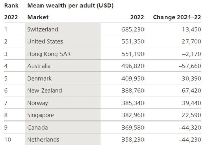 瑞士排名第一,人均財富達到68.5萬美元;美國排名第二(55.1萬美元);中國香港(55.1萬美元)和澳大利亞(49.6萬美元)緊隨其後。德國排在第16位,落後於法國、英國和中國台灣。法國人平均財富比德國人多出5.6萬美元。法國約爲31.2萬美元,中國台灣約爲27.4萬美元,德國約爲25.6萬美元。