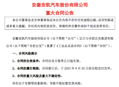 消息面上,安凱客車8月15日公告稱,公司近日與合肥公交籤署了《工業品买賣合同》,公司向合肥公交供應安凱牌客車150輛,合同總金額1.32億元,合同籤訂後於2023年9月30日前分批交付完畢。