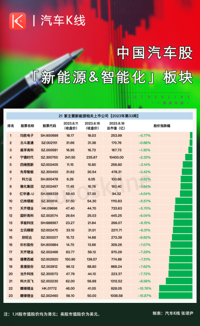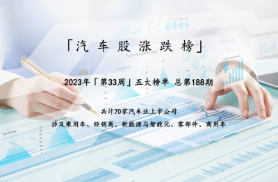 2023年第33周,新能源&智能化板塊全线飄綠,一周股價平均下跌5.54%、總市值僅次於乘用車板塊,爲2.33萬億元。