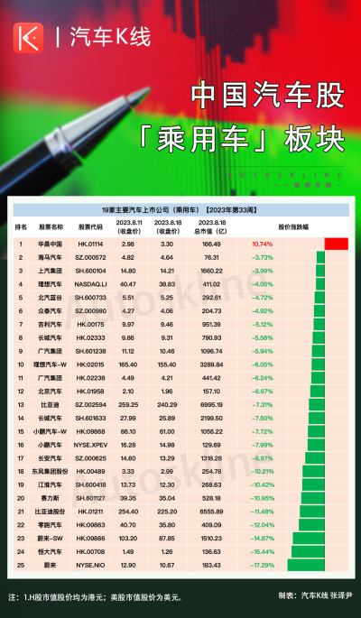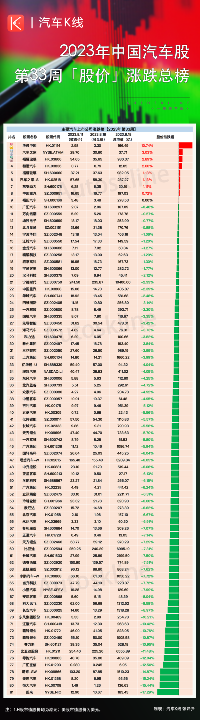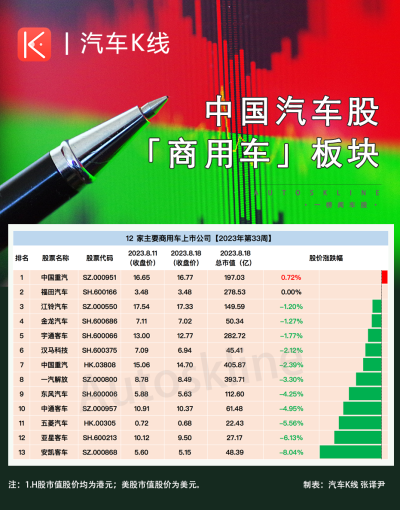 2023年第33周,《汽車K线》統計在冊的81只汽車股大面積飄綠,一周平均股價下跌5.16%,累計總市值跌至6.56萬億元。其中,實現上漲的個股僅8只,福田汽車持平,余下72只個股均出現下滑。