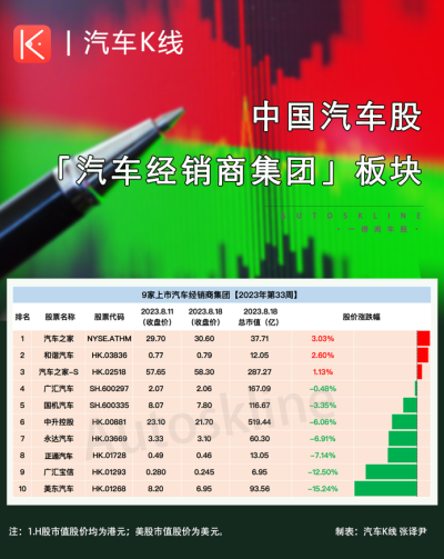 2023年第33周,汽車經銷商集團板塊大面積飄綠,一周平均股價下滑4.49%,當期收盤總市值爲1481.09億元。其中,上漲的個股僅3只,下滑的達7只。