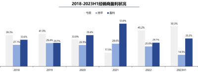 根據中國汽車流通協會發布的2023年上半年全國汽車經銷商生存狀況調查報告顯示,2023年上半年經銷商的虧損的比例爲50.3%,盈利的比例35.2%,持平的比例爲14.5%。虧損面處於近年的高位。