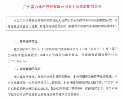 8月10日,富力地產發布公告稱,截至6月30日,公司及下屬子公司有兩筆金額達到1000萬元的商票爲逾期狀志,前述商票逾期金額合計3072.74萬元。
