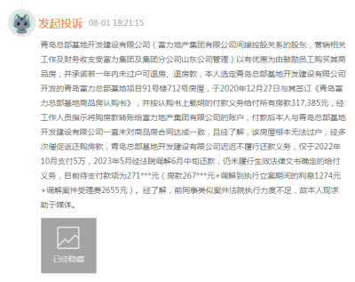 此員工指出,青島總部基地开發建設有限公司以有優惠爲由鼓勵員工購买其商品房,並承諾若一年內未過戶可退房、退房款,自己於2020年12月27日與青島總部基地开發建設有限公司籤訂《青島富力總部基地商品房認購書》,經工作人員指示將購房款轉账給富力地產集團有限公司(現爲富力發展集團有限公司)的账戶,付款後與青島總部基地开發建設有限公司一直未對商品房合同達成一致,且經了解,該房屋根本無法過戶,經多次催促返還購房款,青島總部基地开發建設有限公司遲遲不履行還款義務,僅於2022年10月支付5萬,2023年5月經法院調解6月中旬還款,仍未履行生效法律文書確定的給付義務。