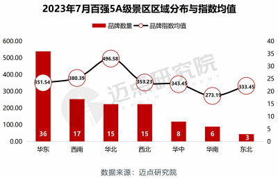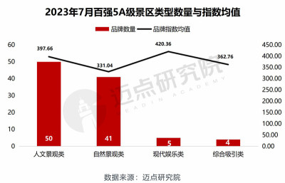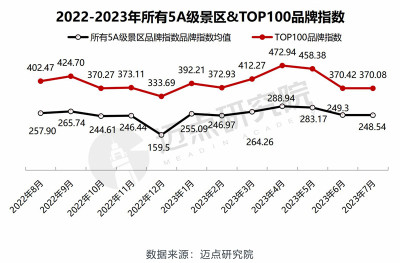經邁點研究院監測,7月所有5A級景區的平均品牌指數爲248.54,環比下降0.30%;100強5A級景區MBI品牌指數均值爲370.08,環比下降0.09%。7月數額相較於6月而言整體趨於平穩,基於暑期六、七月景區品牌指數而言,邁點研究院預測未來八月品牌數值基本不會出現過大波動。