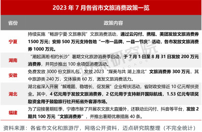 7月暑期福利政策持續不斷,寧夏、湖南、安徽等5省相繼推出各類文旅消費政策,助力“引客入省”措施實施。其中,本月以湖北扶持政策最爲突出,共耗資7.53億元,用於文旅消費券、新开國際航线、市場拓展專項資金三大板塊。同時,本月暑期各景區中高考生免門票政策推出上雖有所遞減,但相關福利政策仍有輸出。