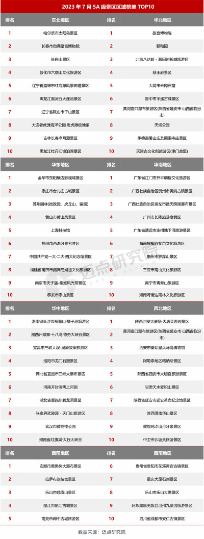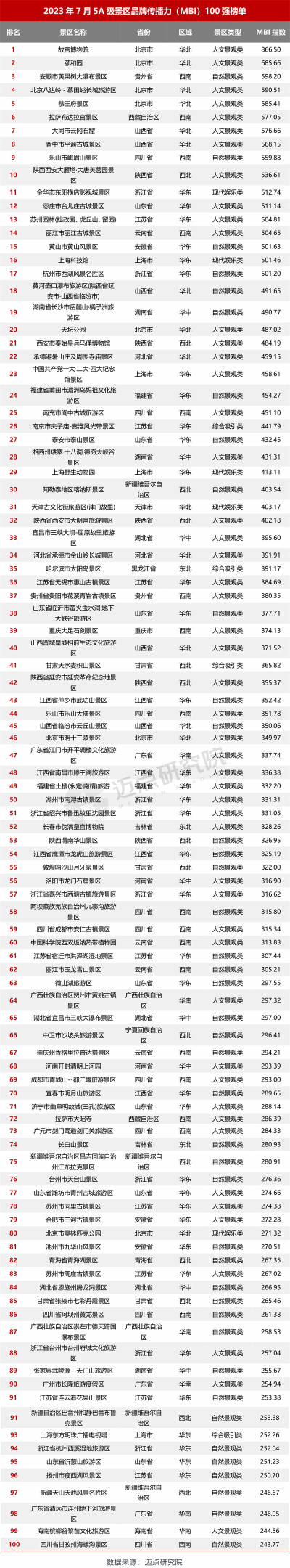 以下是邁點研究院獨家發布“2023年7月5A級景區品牌傳播力(MBI)100強榜單”。 7月,故宮博物院、頤和園、安順市黃果樹大瀑布景區、北京八達嶺-慕田峪長城旅遊區、恭王府景區、拉薩布達拉宮景區、大同市雲岡石窟、晉中市平遙古城景區、樂山市峨眉山景區、陝西西安大雁塔·大唐芙蓉園景區躋身榜單前十。