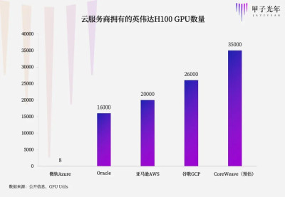 據GPU Utils網站預估,CoreWeave向英偉達預定的的H100數量約爲35000-40000張。對比來看,谷歌在今年5月發布的超級計算機A3擁有大約26000個H100,亞馬遜AWS在7月上线的EC2 P5 虛擬機實例基於20000塊H100構建,微軟在8月上线的Azure ND H100v5虛擬機,僅僅包含8塊H100。不過,微軟擁有大約28.5萬塊A100。