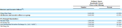 IPO前,Ching Shun Ngan持股42%,Wai Kin Chan持股5%,Chi Keung Yip持股10%,Asia International Securities Exchange Co., Ltd. (“AISE”)持股16.5%,Yuk Hung Sin持股17.25%。