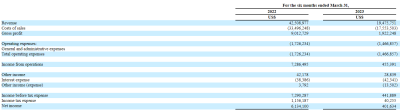 截至2023年3月31日的六個月內,該公司的營收爲1948萬美元,上年同期爲4251萬美元,相應的淨利潤分別爲40萬美元、613萬美元。