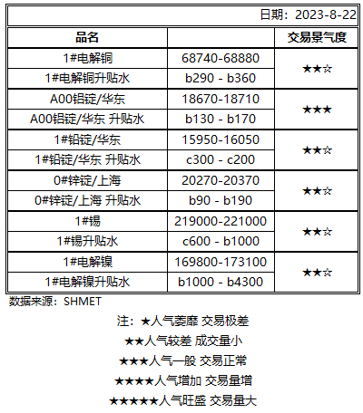 今日上海金屬網1#電解銅報價68740-68880元/噸,均價68810元/噸,較上交易日下跌115元/噸,對滬銅2309合約報報升290-升360元/噸。今早銅價小幅震蕩運行,截止中午收盤滬銅主力合約上漲80元/噸,漲幅0.12%。今日現貨市場成交一般,升水比昨日下跌75元/噸。銅價震蕩走高,下遊按需消費爲主,貿易商下調升水報貨。盤中活躍時段,平水銅升290元左右,好銅升320元左右成交相對集中,溼法銅升250元左右聽聞,差平水有限。截止午間收盤,本網升水銅報升330-升360元/噸,平水銅報升290-升320元/噸,差銅報升240-升280元/噸。