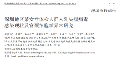2021年7月,深圳市衛生發展研究中心、美年健康研究院和北京大學公衛學院合作共同在中文期刊" 中華流行病學雜志 "上發表了一篇題爲" 深圳地區某女性體檢人群人瘤病毒感染現狀及宮頸細胞學異常研究 "的研究論文。該研究旨在利用深圳地區女性體檢人群的數據,了解人群 HPV 感染及 TCT 異常情況,爲制定地區人群 HPV 感染防治措施(如健康教育和制定疫苗接種方案)、降低 HPV 感染率、預防宮頸癌的發生提供相應的科學依據。
