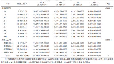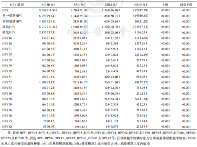 研究發現,HPV標化感染率達19.89%,在年齡分布上呈現“U”形趨勢。主要流行的HPV型別爲HPV52、HPV51、HPV16、HPV58、HPV53。高危型 HPV(17 種)標化感染率高於低危型 HPV(6種),單一HPV標化感染率高於與其他型別混合感染的多種型別HPV標化感染率。總宮頸細胞學研究的標化異常檢出結果7.48%,各類別分別爲非典型鱗狀上皮細胞4.58%,低度鱗狀上皮內損傷2.54%,高度鱗狀上皮內損傷0.27%。