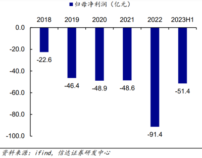 小鵬汽車2022年虧損最爲嚴重,淨虧損約91.4億元。infind數據統計顯示,2018—2023上半年,小鵬汽車累計淨虧損約309億元。