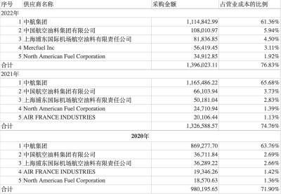 另外,國貨航還存在供應商集中度高且依賴第一大供應商的情況。據招股書披露,國貨航的主要採購項目爲客機貨運、航油、起降服務、維修服務等,2020年-2022年,公司向前五大供應商的採購金額分別爲98.02億元、132.66億元和139.60億元,佔總採購額的比例分別爲71.90%、74.76%和76.83%。其中,國貨航向第一大供應商中航集團的採購金額佔比分別爲63.76%、65.68%和61.36%,佔比較高。