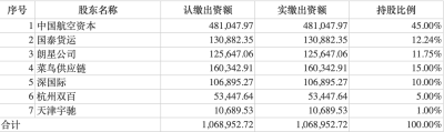 2020年1月,國貨航有限的注冊資本增加18.44億元,由中國航空資本認繳;2021年9月,國貨航有限的注冊資本增加33.14億元,由菜鳥供應鏈認繳16.03億元、深國際認繳10.69億元、杭州雙百認繳5.34億元、天津宇馳認繳1.07億元。