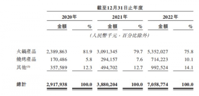 鍋圈最大營收來源火鍋產品佔總營收的比例已經從2020年的81.9%下降到了2022年末的75.8%。而燒烤產品、其他產品的佔比均有不同程度的提高。