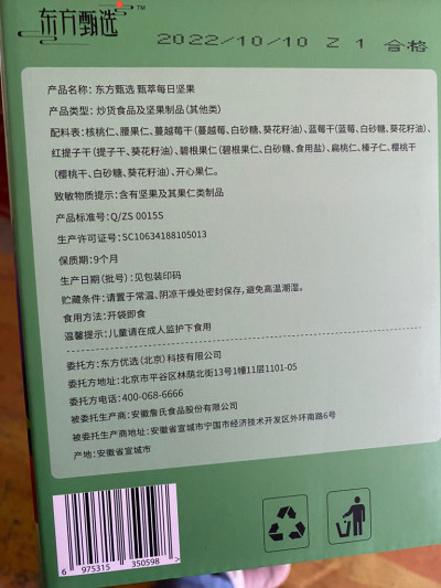 上周3月30日在東方甄選app下單了自營的每日堅果,喫了一樣堅果,有些油味,感覺不新鮮了,就特意找了下包裝盒的生產日期,不看不知道,原來是22年10月10日的生產的,保質期9個月,這都已經馬上過7個月了,是臨期食品了。真是感覺東方甄選自營品馬上也要爆雷了。