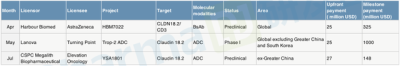 2022年,共有3家國內藥企分別完成了Claudin18.2相關管线的對外授權,包括禮新醫藥的雙抗、和鉑醫藥的ADC、石藥集團的ADC。