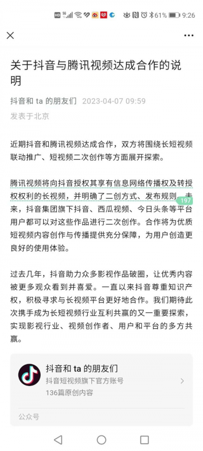 最近騰訊與抖音就長、短視頻版權問題“握手言歡”,雙方宣布“將圍繞長短視頻聯動推廣、短視頻衍生創作开展合作。”這一舉措,引起了社會的廣泛關注與討論。被看做是“長短視頻之爭的一個“新拐點”。