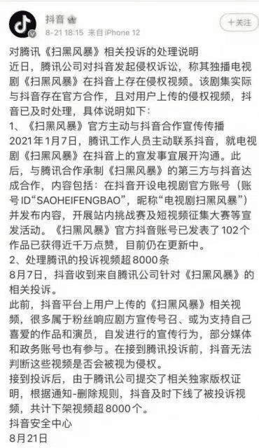 2021年8月,因《掃黑風暴》一劇,#騰訊視頻起訴抖音侵權索賠1億#衝上熱搜。接到投訴後,抖音及時下线了被投訴視頻,共計下架視頻超8000個。