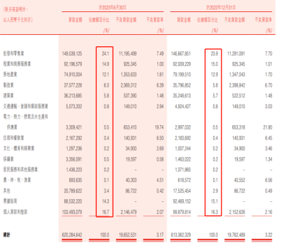 從公司貸款投放的行業來看,向批發和零售業、租賃和商務服務業、房地產業、制造業、建築業客戶提供的貸款是其公司貸款的最大組成部分。但從金額和佔比上來看,較上年末並未有明顯的變化,百分比變動基本上在0.1%-0.2%兩個數值間變動。