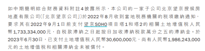 值得注意的是,SOHO中國子公司北京望京搜候房地產有限公司於2022年8月收到當地稅務機關的稅項繳納通知,要求其在2022年9月1日前支付望京SOHO項目塔1、塔2的相關土地增值稅17.33億元,自稅款滯納之日起按日加收滯納稅款萬分之五的滯納金。截至2023年6月30日,公司已支付土地增值稅3060萬元,尚有19.86億元的土地增值稅和相關滯納金未被償付。