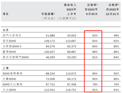 SOHO中國的寫字樓與零售物業租賃項目也處於持續走低的狀態。截至2023年上半年底,SOHO中國的投資物業平均出租率爲約79%。其中,北京項目中,前門大街項目、望京SOHO、銀河及朝陽門SOHO的出租率僅爲62%、64%、61%,雖然較上年有所增長,但仍然低於平均出租率。業內人士表示,未來3年,隨着大批新增供應陸續入市,SOHO中國的租金和出租率或將持續承壓。