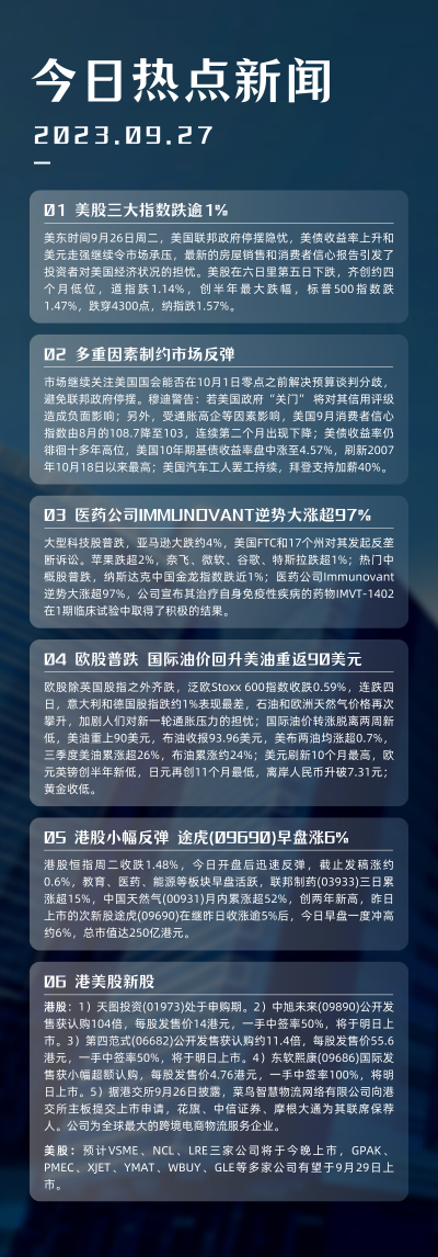 市場繼續關注美國國會能否在10月1日零點之前解決預算談判分歧,避免聯邦政府停擺。穆迪警告:若美國政府“關門” 將對其信用評級造成負面影響;另外,受通脹高企等因素影響,美國9月消費者信心指數由8月的108.7降至103,連續第二個月出現下降;美債收益率仍徘徊十多年高位,美國10年期基債收益率盤中漲至4.57%,刷新2007年10月18日以來最高;美國汽車工人罷工持續,拜登支持加薪40%。
