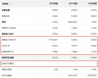 2022年,經營开支總額爲5.51億元。其中,銷售及分銷支出7118.2萬元,行政开支約2.95億元,其他开支約1.84億元,融資成本約1697.3萬元。即僅行政开支一項,便大於同期營收。