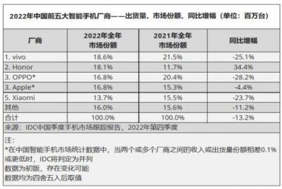 首先,國內強者如林。IDC數據顯示,2022年中國前五大智能手機廠商分別是vivo、榮耀、OPPO、蘋果、小米。vivo市佔率18.6%,前五更佔據了84%的市場份額。