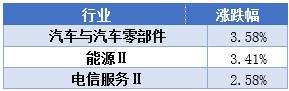 盤面上看,汽車與汽車零部件、能源Ⅱ、電信服務Ⅱ漲幅分別爲:3.58%、3.41%、2.58%。食品與主要用品零售Ⅱ、制藥、生物科技與生命科學、商業和專業服務跌幅分別爲:-0.90%、-0.90%、-0.60%。