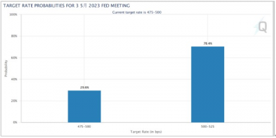 市場預期美聯儲5月加息25個基點後停止加息。3月份,在美國能源、食品以及核心商品的通脹繼續放緩的同時,勞動力市場降溫明顯。而進入到4月,勞動力市場通脹顯現出繼續下降的跡象,4月8日當周初次申請失業金人數再錄得超預期的23.9萬人。與之相反,前期拉低通脹的能源通脹4月有回升的可能。4月2日,包括沙特和俄羅斯在內的歐佩克+成員國宣布在協議之外再自愿減產約160萬桶/日,本次減產約佔全球石油產量的1.5%。同時,美國能源部長格蘭霍姆表示,美國計劃補充战略石油儲備至俄烏衝突前的水平。根據美國能源部數據,俄烏衝突前美國战略石油儲備約爲5.8億桶,而當前約爲3.7億桶。兩則重磅消息衝擊下,截至4月13日,4月以來布倫特原油、WTI原油均價分別較3月均價提升了7.8%和10.6%。結合此前3月美聯儲議息會議給出的點陣圖指引,市場預期美聯儲5月加息25個基點後停止加息。截至4月13日,芝加哥商品交易所的FedWatch工具顯示,市場對於美聯儲5月加息25個基點的預期佔70.4%,停止加息的預期佔29.6%。