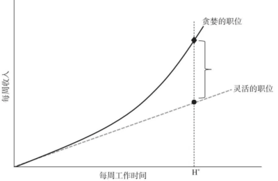 注:假設一個工作安排靈活,不管員工每周工作多少小時,時薪都一樣;另一職位靈活性很低,工作時間越長,時薪就越高。菱形(貪婪職位)和圓點(靈活職位)之間的差異代表不選擇貪婪職位的員工每周要放棄的 。