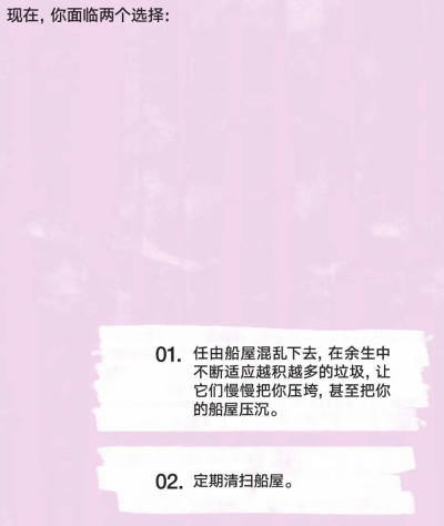 要清掃船屋裏的垃圾,你必須把它們從一個地方挪到另一個地方去。它們不能在兩個地方同時存在。同樣,你那些沒什么用的想法也無法同時存在於兩處。你的任務就是把它們挪到你腦袋以外的地方去。
