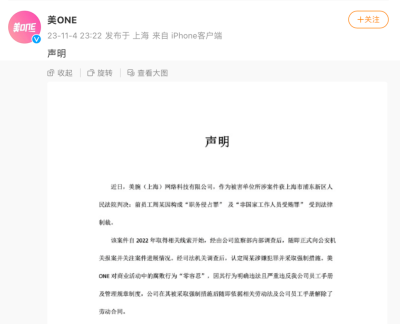 針對“李佳琦公司招商專員收好處費超百萬”的事件,美ONE在11月4日深夜在微博發表聲明表示,涉事員工的行爲明確違法且嚴重違反了公司的員工手冊及管理規章制度。公司在得知該員工被採取強制措施後,已立即解除了與其的勞動合同關系。
