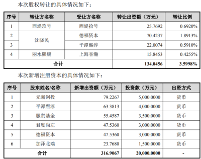 同月進行的第二次增資,熙華有限的注冊資本增加至4040.56萬元,其中德福資本、君度尚左、加澤北瑞、平潭熙淳、元晰創投、服貿基金共計投資2億元認購316.9067萬注冊資本,增資價格爲63.11元。