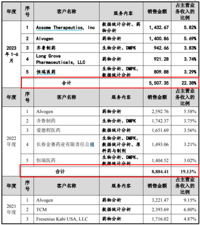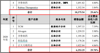 其中,報告期各期末熙華檢測向TCM、齊魯制藥等前五名客戶合計銷售額分別爲6253.25萬元、1.04億元、8884.41萬元和5507.35萬元,佔主營業務收入的比例分別爲29.70%、29.46%、19.13%和22.38%。
