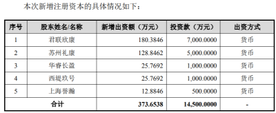招股書披露,2020年8月21日,熙華有限召开股東會會議並作出決議,公司注冊資本增加至3723.65萬元,其中君聯欣康投資7000萬元認購新增注冊資本180.38萬元,蘇州禮康、華睿長盈、上海譽瀚和西堤玖號分別投資5000萬元、1000萬元、500萬元和1000萬元,分別認購128.85萬元、25.77萬元、12.88萬元和25.77萬元注冊資本。由此計算,五名股東的增資價格爲38.81元。