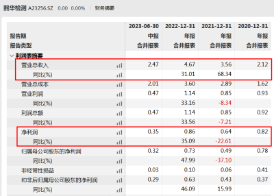 2020年—2023年上半年(以下簡稱:報告期),熙華檢測的營業收入分別爲2.12億元、3.56億元、4.67億元和2.47億元,同期淨利潤分別爲0.82億元、0.64億元、0.86億元和0.35億元;2021年公司淨利潤同比下降22.61%。