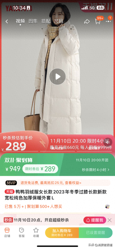 據悉,該活動價格爲雙十一限時秒殺價,活動限時4小時,於11月10日夜間开團。與此同時,消費者還需要領取店鋪商品券,湊上跨店滿減才可獲得該優惠價。