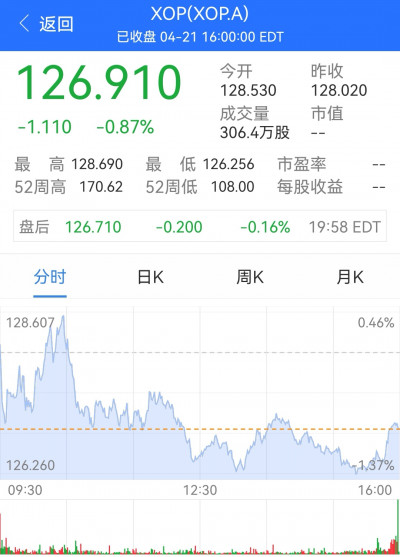 4月21日晚,SPDR標普油氣开採指數EFT(XOP.A)开盤128.530,收盤126.910,-1.110,-0.87%。