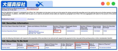Form 144是需要受限制交易股票在交易時需要提交的表格,而根據相關的表格,這部分股權是2014年9月份獲得,爲創始人股份,這部分的股票價值8.7億美元,約合63億人民幣。