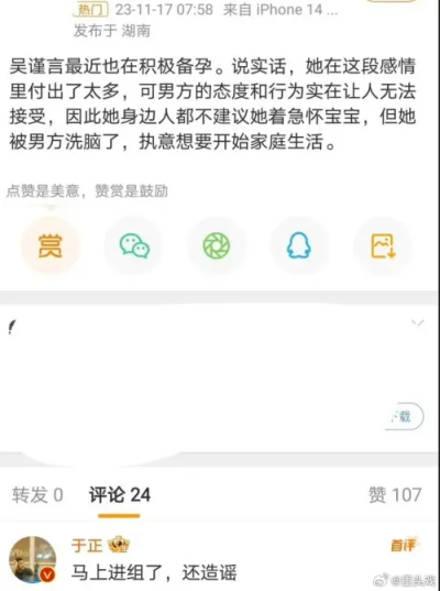 ▲娛樂營銷號瘋傳吳謹言想備孕生子,於正出面否認傳聞。(圖/翻攝自微博)對此,吳謹言的老闆於正回應粉絲,表示她沒進劇組是因為一直在進修,上課學習表演、演話劇,澄清旗下藝人市場反應很好,這2年有11部戲劇找她,更直接在營銷號文章底下留言