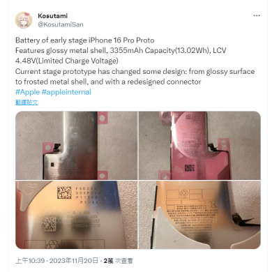 針對iPhone 16 系列將搭載改良版的新型電池模組,對此,爆料客(原推特)表示,取得聲稱為iPhone 16 Pro 早期開發版本的電池原型零組件實機,電池模組仍維持先前歷代的L型電池,但跟過往前幾代很不一樣的是,電池模組外觀原本都是灰黑色,用於iPhone 16 Pro 手機的新型設計,則是在電池模組的外層部份,多了一層帶有磨砂表面處理的金屬外殼,並標示電池容量為3355mAh(前代iPhone 15 Pro為3274mAh)。另,電池模組的電源連接器端也經過重新改良的設計。
