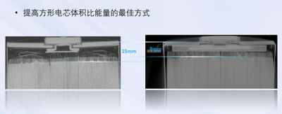 據介紹,“問頂電池”的創新之處在於縮短極耳長度,改變其與轉接片的連接方式,採用一體化焊接技術,使得電芯內部結構實現了一體化的連接,把原有的頂部空間由15mm縮減到了8mm,使電芯內部空間利用率有效提升7%以上。